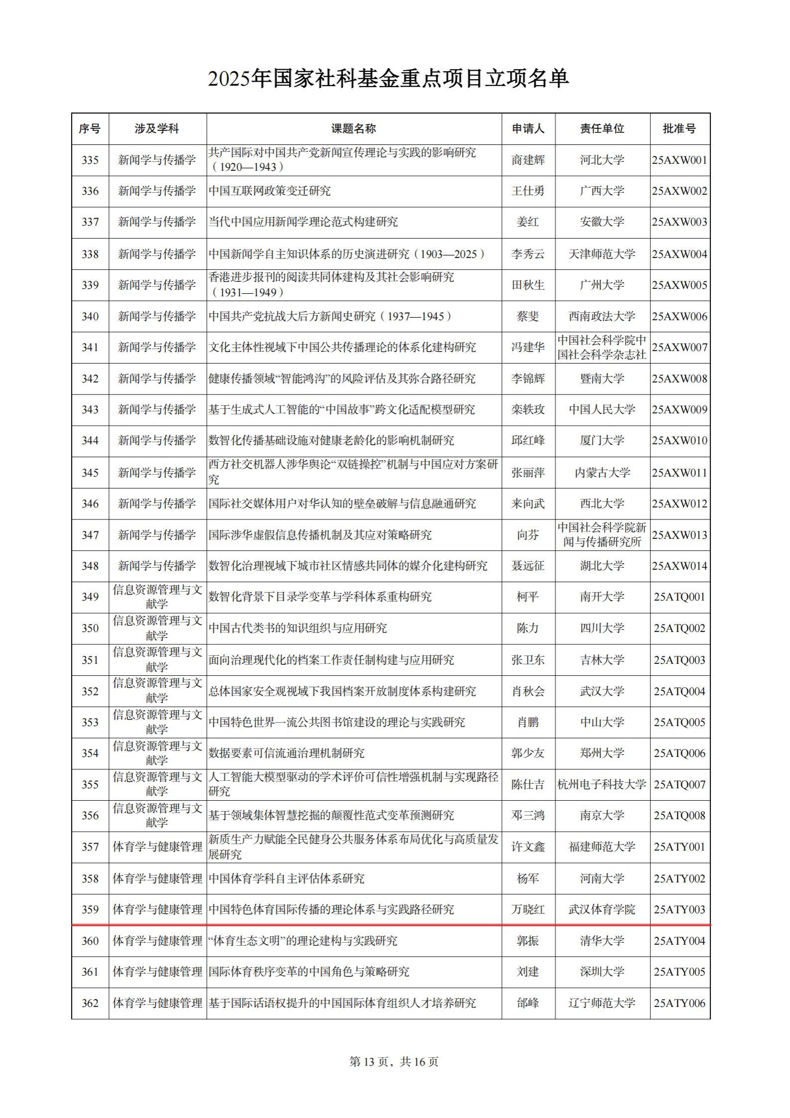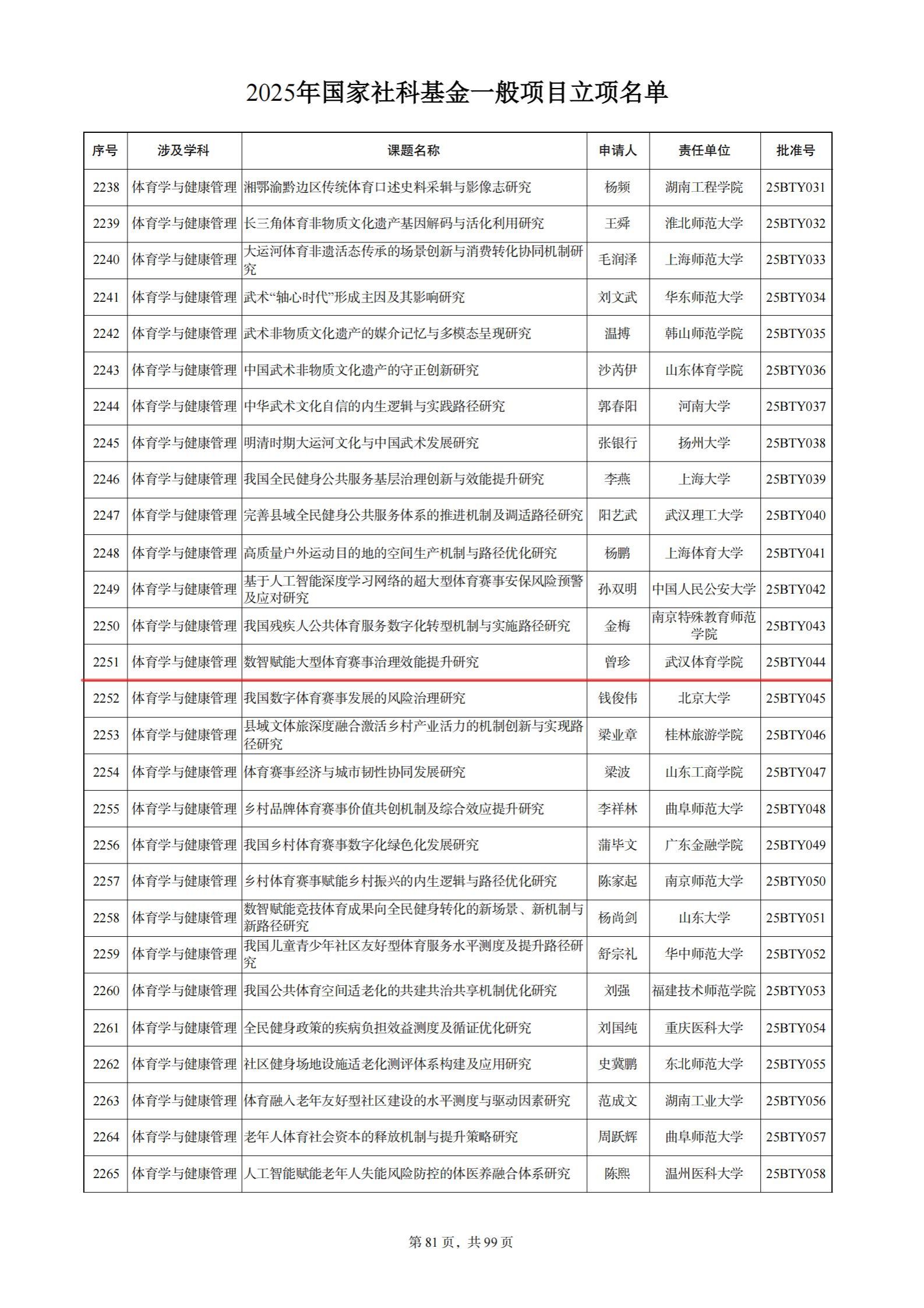 9月29日,2025年度国家社科基金年度项目立项结果正式公布。中心申报的两项课题成功获得立项,包括一项重点项目和一项一般项目,标志着中心在体育哲学社会科学研究领域的实力与影响力持续提升。